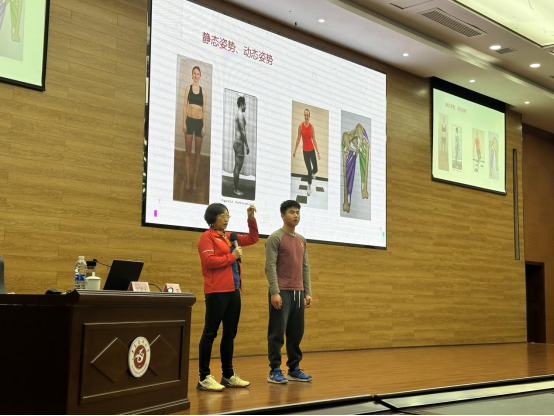 讲座现场,矫教授为三位同学进行了静态姿势与动态姿势的评估演示,进一步介绍了如何进行运动伤害风险因素的评估与矫正,强调了运动防护工作中运动损伤的预防是重点,肌肉失衡的评估纠正是关键。矫教授还从离心训练在体能与康复中的重要性,渐进性功能训练是运动防护训练的精髓,医务监督的重点工作等方面抛出运动康复领域最新的专业观点与防护思路。