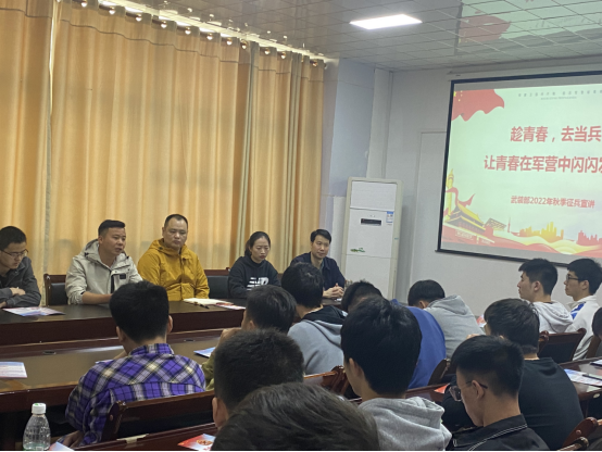 为做好公司2022年秋季征兵工作,鼓励优秀毕业生参军入伍,公司于4月20日上午10点,在公司会议室召开2022年毕业生征兵动员会暨毕业生应征入伍政策宣讲会。会议由公司专职辅导员肖伟主持,公司武装部部长刘承亮、公司优秀退役毕业生付璇、通过士兵计划顺利考研的陈天菊同学以及2018级毕业班适龄男生共计50余人参加会议。